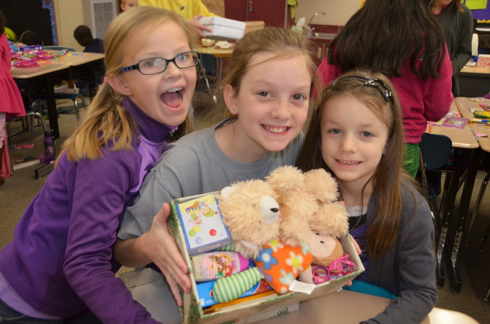 After well over a month of talking about it, planning and working to collect funds and supplies to fill shoeboxes, yesterday was the big day of stuffing the shoeboxes. Students set up a sort of store in the classroom with art supplies, toiletries, small articles of clothing and lots of toys. The students worked with their character partners to stuff boxes to the near point of bursting, knowing that these treasures would brighten the day of a child some where around the world.